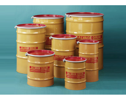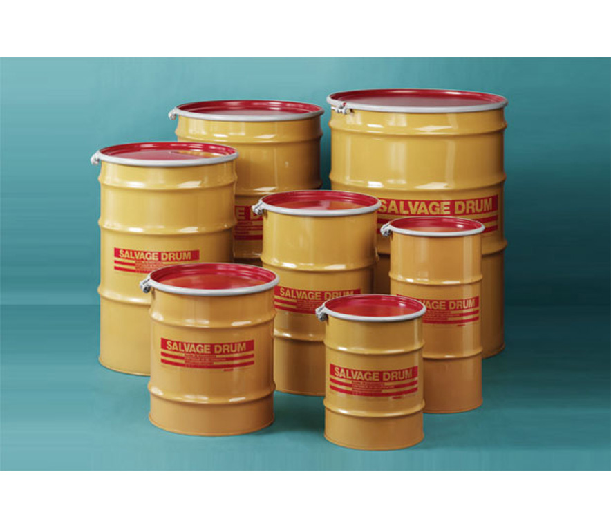 Salvage Drums A Skolnik Open Head Salvage Drum is constructed of high quality carbon steel and meets the UN design type requirements. Standard Salvage Drums feature yellow bodies with yellow or red covers, with a multilingual salvage drum logo in red. Available options include 3/4" vent plugs and corrosion resistant epoxy phenolic lining. Each Skolnik Steel Salvage Drum tests successfully on relevant international standards, including the “T” rated salvage drum.