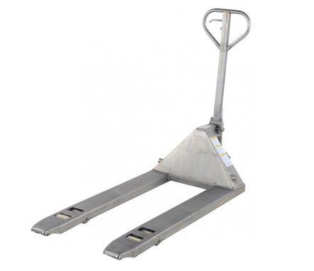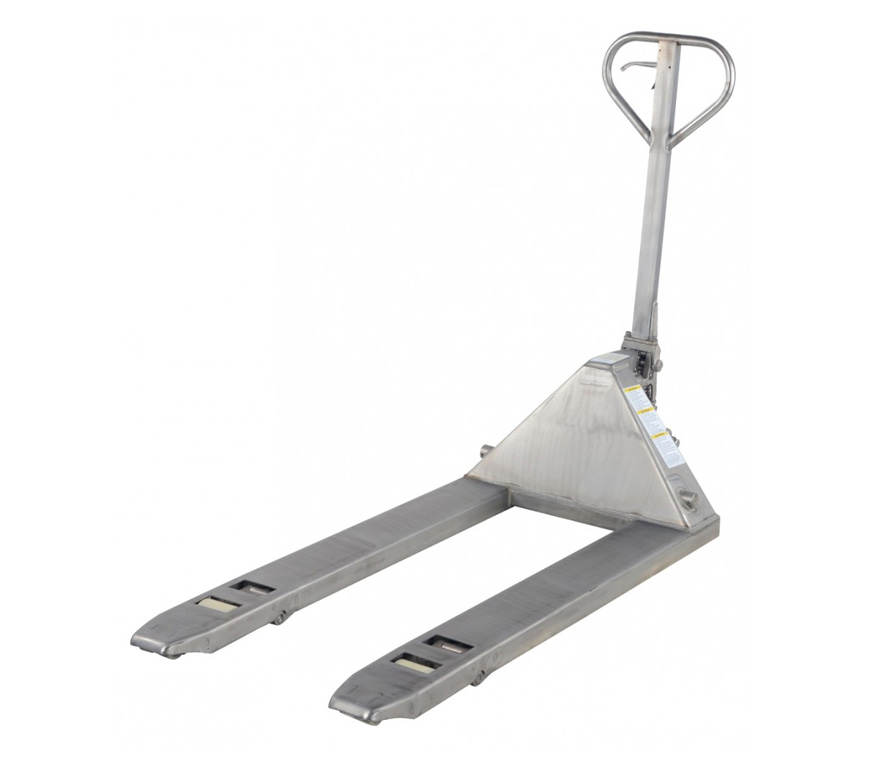Pallet Trucks Stainless Steel model PM5-2748-SS Ideal for sanitary, pharmaceutical, medical, food, corrosive and wet environments. Choose type 304 stainless steel frame and forks only or 100% type 304 stainless steel pallet truck for long life in the most harsh environments. 5,500 pounds uniform capacity.