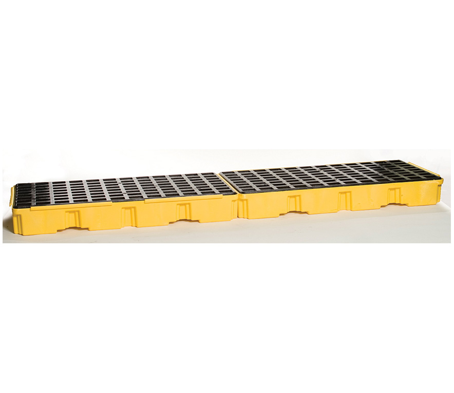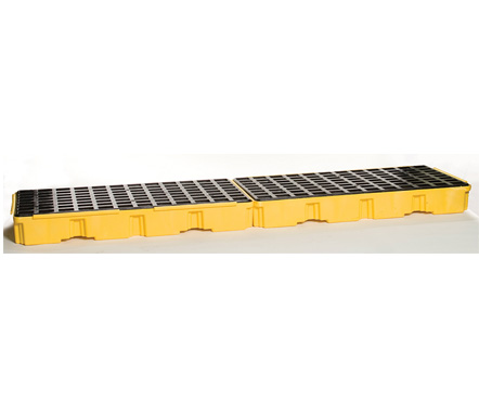 Spill Containment Four Drum in Line Containment Platform Eagle's 4 Drum In-Line Spill Containment Platform is constructed of yellow high density polyethylene (HDPE) for excellent durability and chemical resistance. Features a sump capacity of 60.5 gallons, measures only 6.5" high and has black HDPE flat top grating which removes easily for cleaning (no drain). Platforms can be easily connected with built-in U Channels. Compatible with the Eagle Poly Pallet Ramp (Model 1689 in yellow and 1689B in black) for easier loading and unloading. Meets EPS 40 CFR 264.175 and is SPCC Compliant