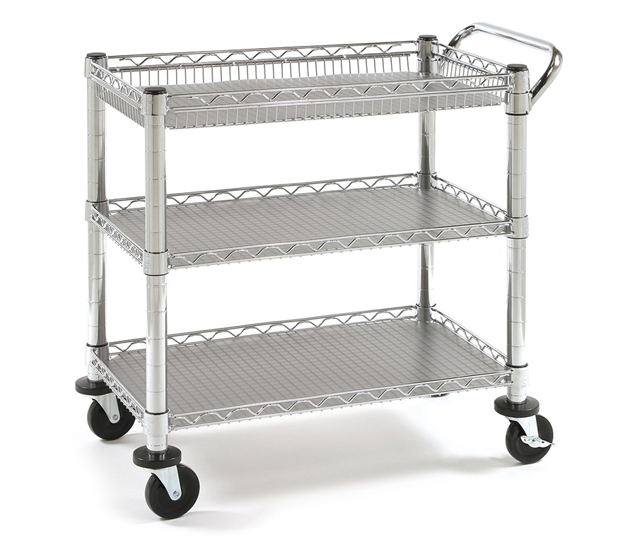 This conveniently mobile cart comes with a steel handle push-bar, four heavy-duty PVC wheels (two are locking), four protective bumpers and has an overall weight capacity of up to 500 lbs. This durable cart measures 33.75-inches by 18-inches and by 32.25-inches high.